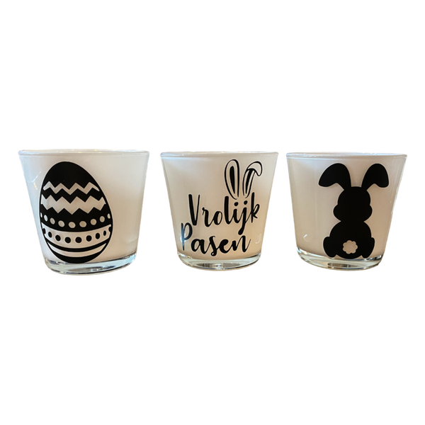 Met dit leuke setje glazen theelichthouder met theelichtje kan je het gezellig maken s’avonds tijdens de paasperiode. Ze zijn ook mooi als decoratie door de dag om helemaal in de paassfeer te komen.